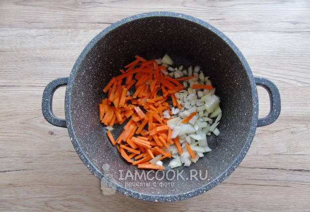 Морковь и репчатый лук очистите, помойте и нарежьте произвольно, но не очень крупно. Выложите в глубокую сковороду, сотейник или казан.