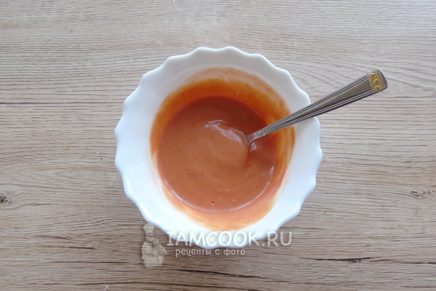 Приготовьте соус. В мисочку выложите томатную пасту, сметану, соль, сахар и крахмал. Налейте 70 мл холодной кипяченой воды и перемешайте до однородной консистенции.