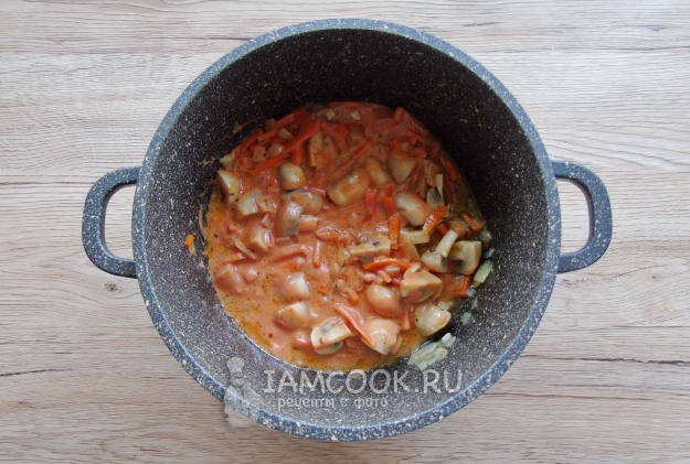 Добавьте соус в казан с морковью, луком и грибами, перемешайте.