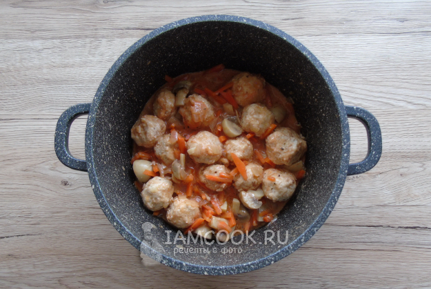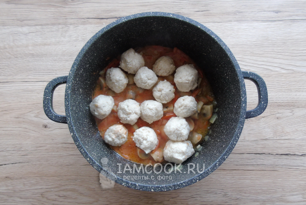 Переложите фрикадельки в казан с овощами, грибами и соусом.