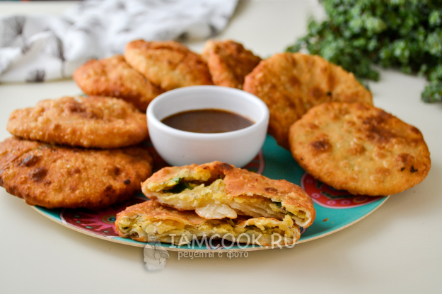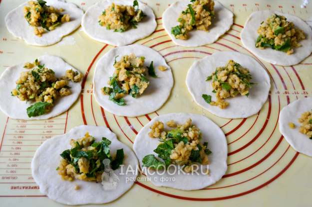 Отдохнувшее тесто разделите на равные небольшие кусочки. Каждый кусочек раскатайте в тонкую лепешку, в центр положите щедрую порцию начинки.