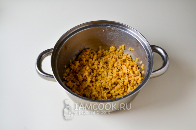 Красную чечевицу промойте, залейте холодной водой, посолите и сварите до мягкости. Время приготовления смотрите на упаковке чечевицы. Если вода впиталась не вся, то слейте ее с чечевицы.