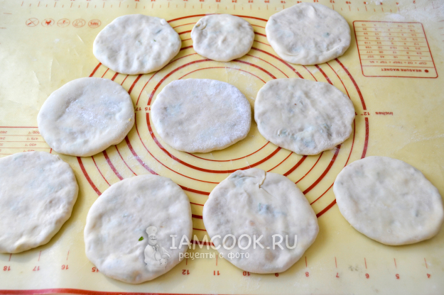 Переверните мешочки швом вниз, руками аккуратно растяните в лепешку. Можно воспользоваться скалкой.