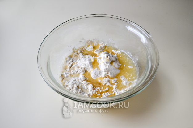 Влейте растопленное кокосовое масло и понемногу вливайте воду. Ложкой сразу же перемешивайте муку.