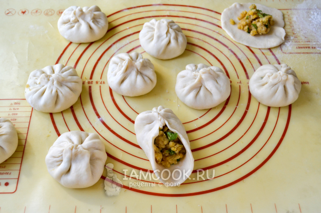Соберите тесто складочками, защипните, чтобы начинка осталась внутри. Получаются мешочки, немного напоминающие хинкали.