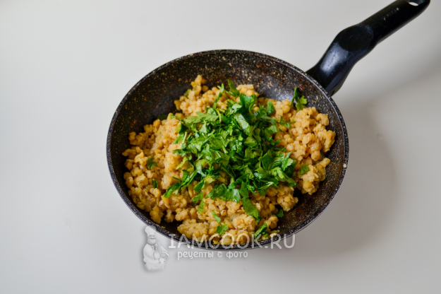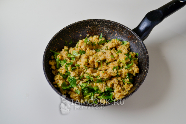 Положите в сковороду со специями вареную чечевицу, добавьте мелко нарезанную зелень.