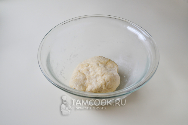 Затем руками замесите тесто. Оно должно быть упругим, не прилипать к рукам. Накройте миску пищевой пленкой и оставьте тесто, пока будете заниматься начинкой.