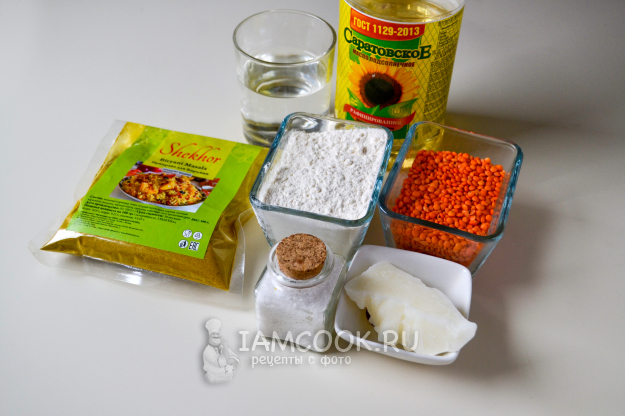 Соберите продукты для приготовления индийских лепешек качори. Я использую для начинки красную чечевицу - она быстро готовится и без предварительного замачивания. Из специй - готовая приправа для бирьяни, в которой есть все необходимые пряности.