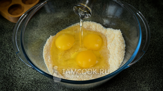 Вбейте яйца и добавьте оливковое масло.