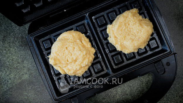 Включите вафельницу разогреваться и смажьте рабочие поверхности тонким слоем растительного масла с помощью силиконовой кисточки. Выложите на разогретые панели по 2-3 ст.л. миндального теста и закройте крышку вафельницы.