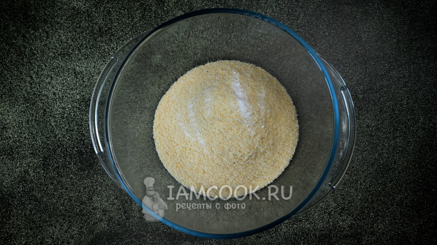 В миску насыпьте миндальную муку и добавьте к ней разрыхлитель. Перемешайте.