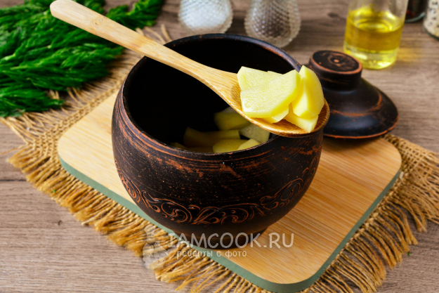 Влейте в горшочек теплую, хорошо подогретую воду - так суп быстрее закипит в духовке. Также добавьте в суп несколько листочков лавра для аромата, посолите и поперчите по вкусу. Горшочек прикройте крышкой и отправьте в духовку.