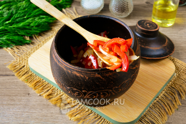 Туда же добавьте и обжаренные овощи - лук с красным перцем.