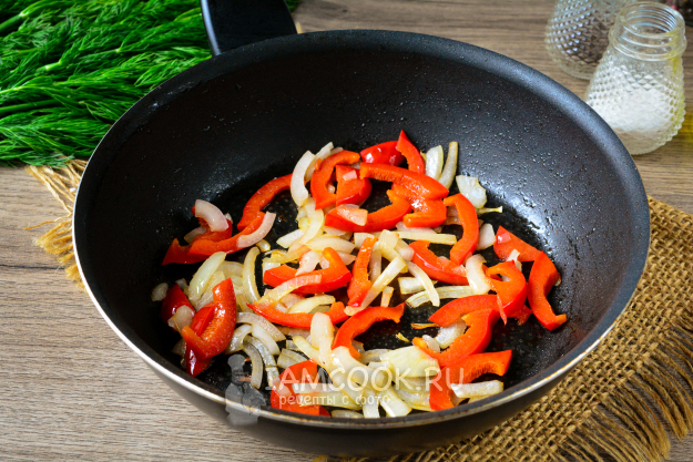 Сковороду смажьте растительным маслом, пассеруйте лук с перцем пару минут. Затем также обжарьте и шампиньоны, чтобы они стали более ароматными.