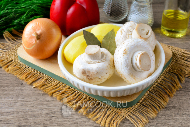 Соберите все необходимые продукты для приготовления грибного супа в горшочках в духовке.