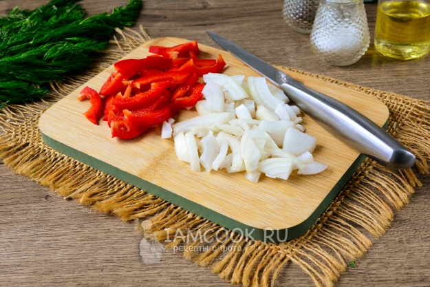 Почистите лук и сладкий красный перец. Овощи нарежьте полукольцами.