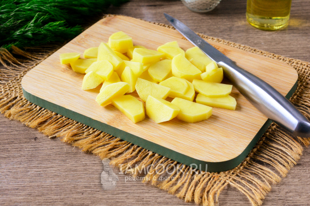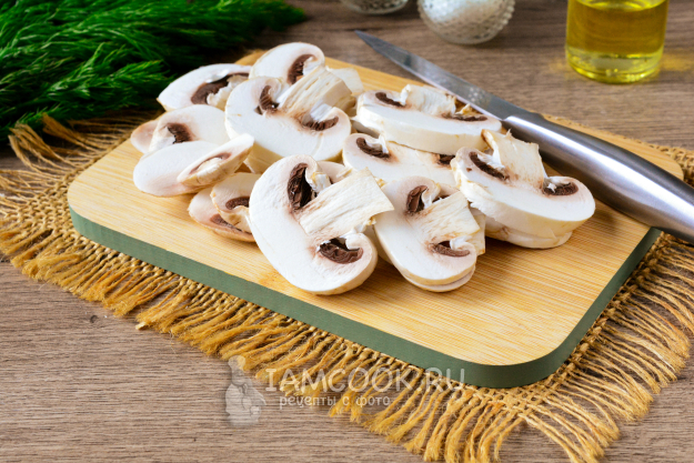 Шампиньоны почистите, нарежьте пластинами для супа.