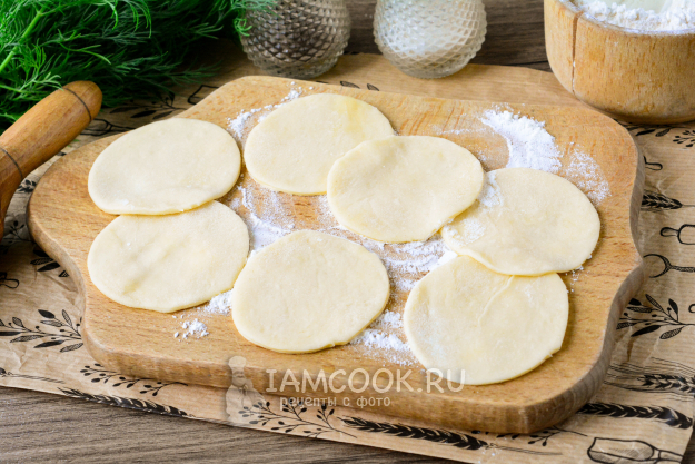 Тесто тонко раскатайте и выдавите кружочки-заготовки диаметром около 5 см.