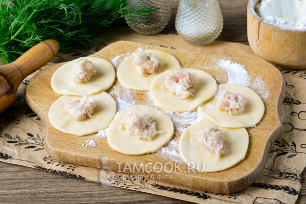 В центр каждого кружка выложите начинку из мяса и картошки.
