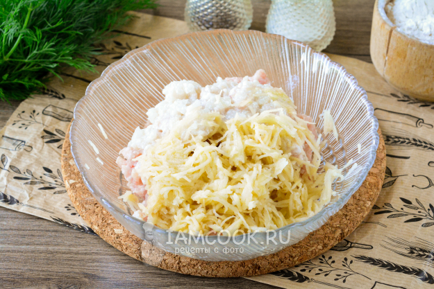 Почистите репчатый лук и картофель. Овощи натрите на мелкой терке и добавьте к свиному фаршу.