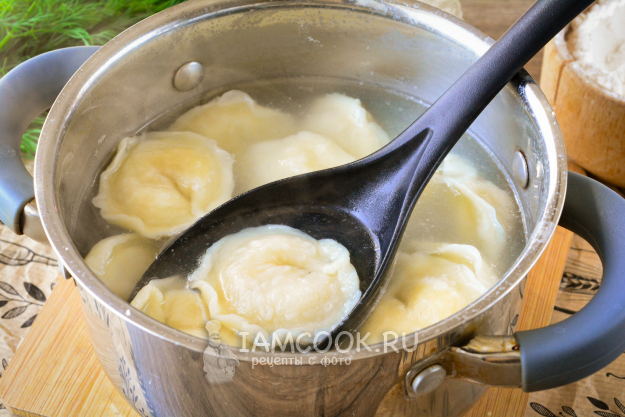 В кипящую подсоленную воду выложите пельмени, перемешайте. После того как пельмени всплывут, варите их 3-4 минуты.