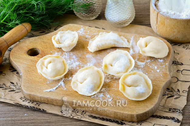 Защипните края, как на вареники, а затем соедините два полученных края, чтобы сформировать правильную форму пельменя. Таким образом слепите все пельмени. Часть пельменей можете заморозить впрок.