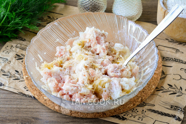 К фаршу добавьте соль и черный перец, перемешайте, начинка готова.