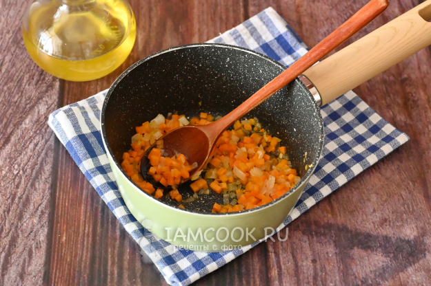 Первым делом на растительном масле поджарьте нарезанные лук с морковью до прозрачности и лёгкого золотистого цвета, примерно 10 минут.