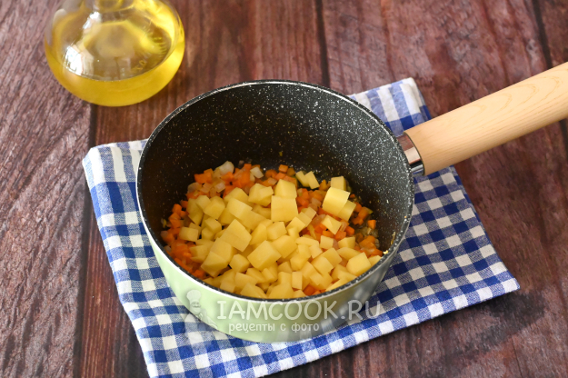 К ним отправьте нарезанный кубиками картофель.