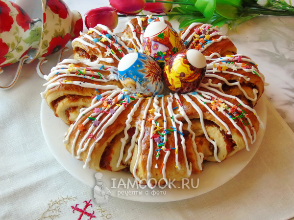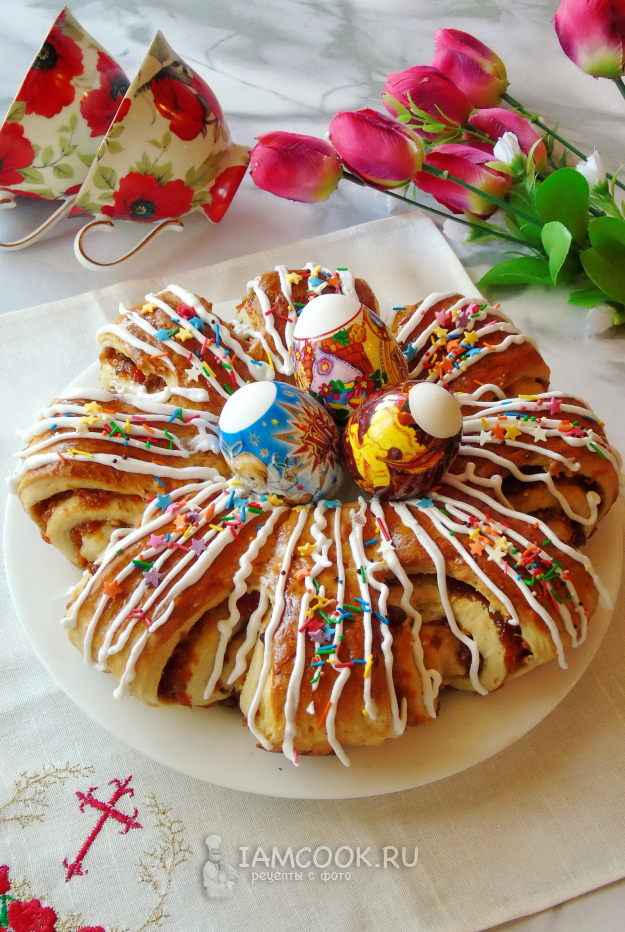 Выпекайте венок в духовке, разогретой до 180-185 градусов, 35-40 минут. Время выпекания зависит от вашей духовки. В этот раз я пекла в газовой. В моей электрической духовке пирог печется 30-35 минут.