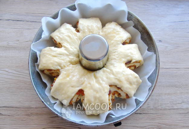 Накройте пищевой пленкой и дайте постоять при комнатной температуре 20-25 минут. Затем смажьте яйцом.