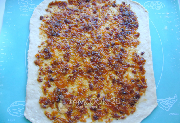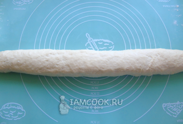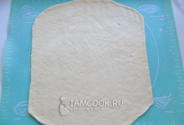 Подошедшее тесто достаньте из миски и обомните. Раскатайте в прямоугольник.