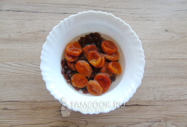 А пока тесто подходит, займитесь начинкой. Изюм и курагу залейте кипятком и дайте постоять 10 минут. Затем воду слейте.