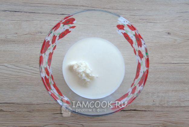 Перемешайте венчиком дрожжи, молоко, творог, масло, яйцо, сахар, ванильный сахар и соль.