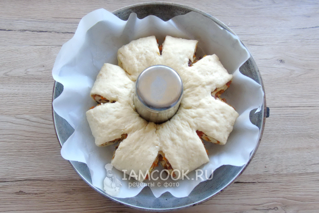 Концы рулета соедините, закрепите и выложите в форму для выпечки. По бокам сделайте 8 надрезов.