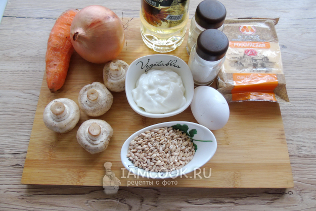 Соберите ингредиенты для приготовления запеканки из перловки.
