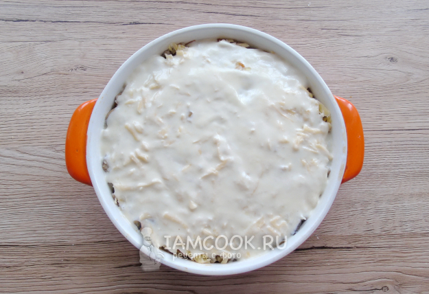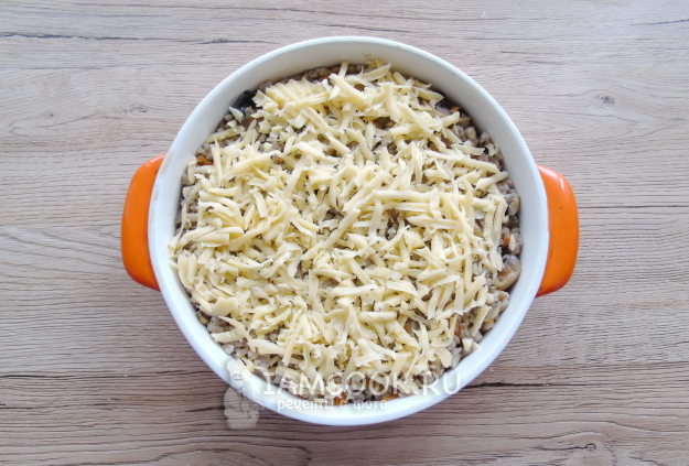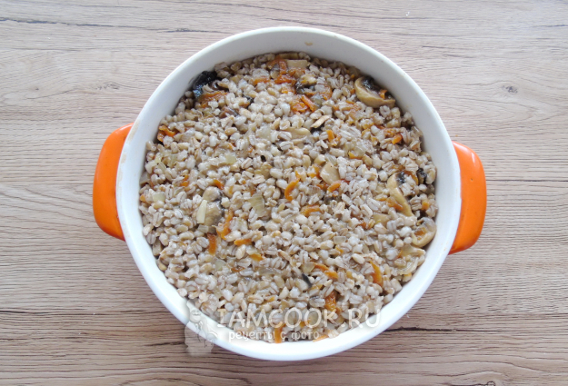 Жаропрочную форму смажьте растительным или сливочным маслом. Выложите перловку с грибами и овощами.