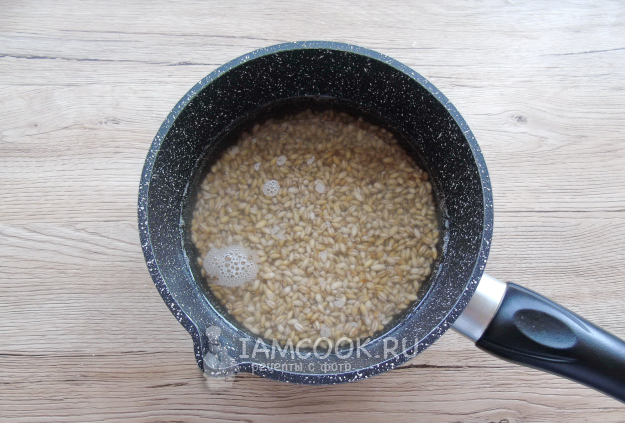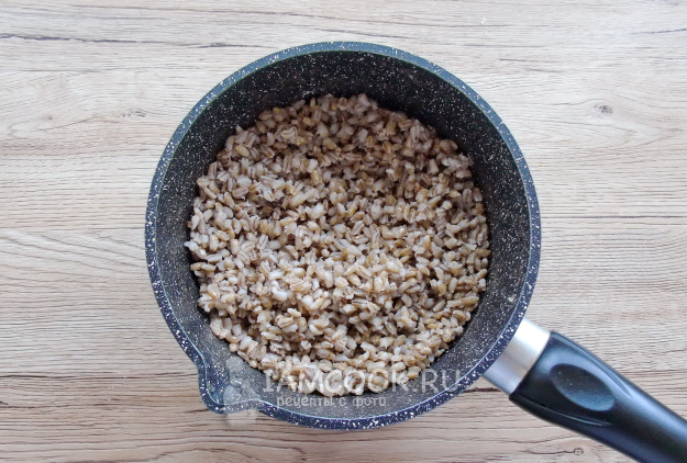 Утром воду слейте, еще 1 раз промойте перловку и поместите в кастрюлю. Налейте воду, чтобы она приблизительно на палец была выше крупы.