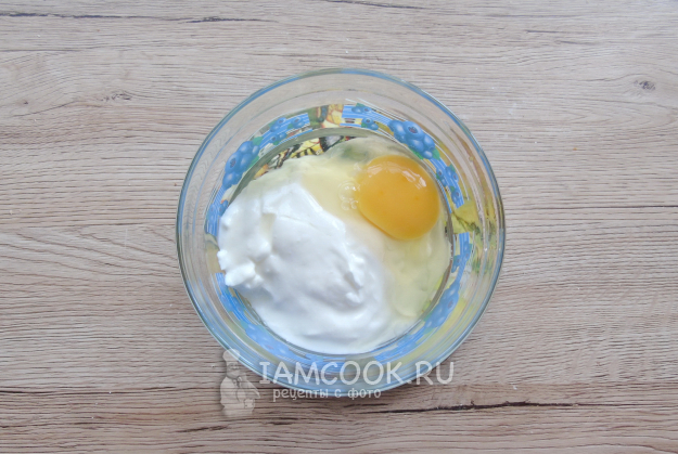 В мисочку выложите сметану, разбейте яйцо.
