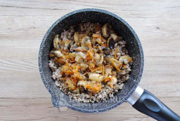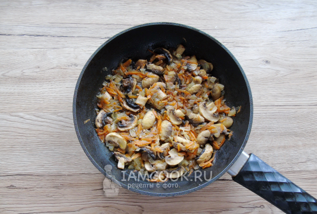 Жарьте лук с морковью и грибами при небольшом нагреве до готовности.