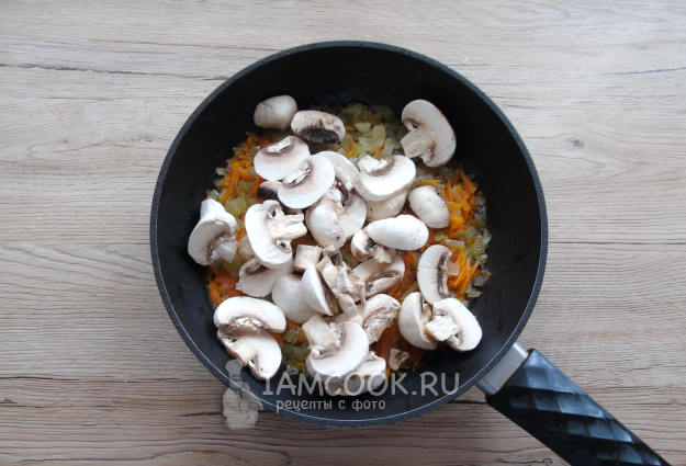 Затем добавьте нарезанные шампиньоны.