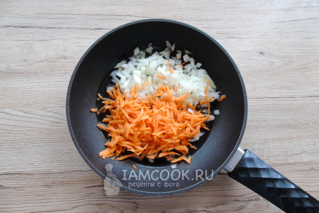 А пока перловка варится, лук мелко нарежьте, а морковь натрите на терке. Выложите в сковороду с растительным маслом.