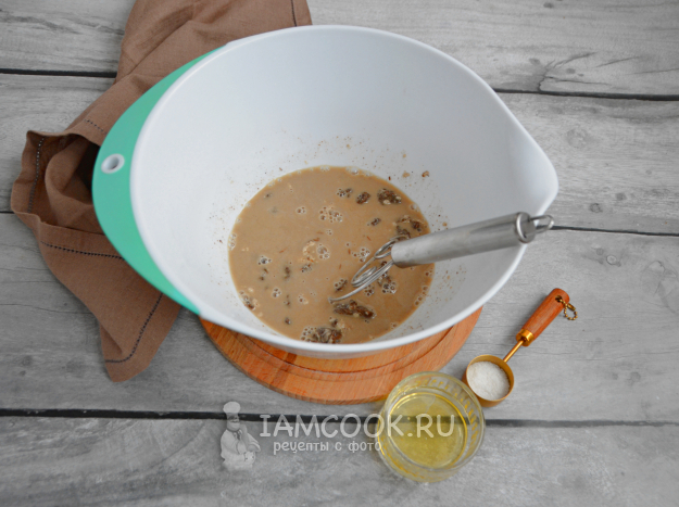 Добавьте в миску заварку, смешайте. Заварка вмешивается неохотно, но в дальнейшем, при замешивании руками, текстура теста выровняется.