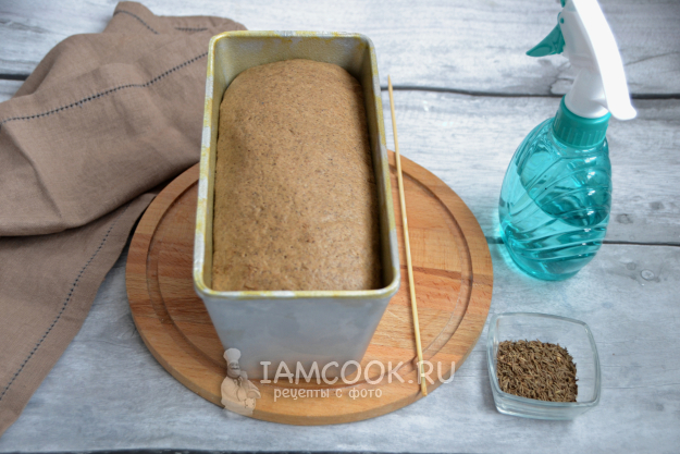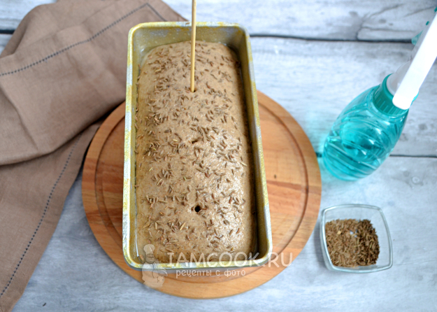 Сбрызните хлеб водой, при желании посыпьте семенами тмина, деревянной шпажкой сделайте несколько проколов, чтобы при выпечке хлеб не потрескался.