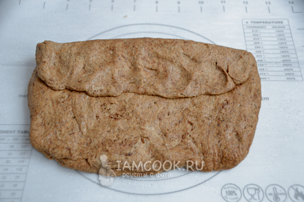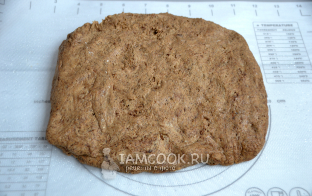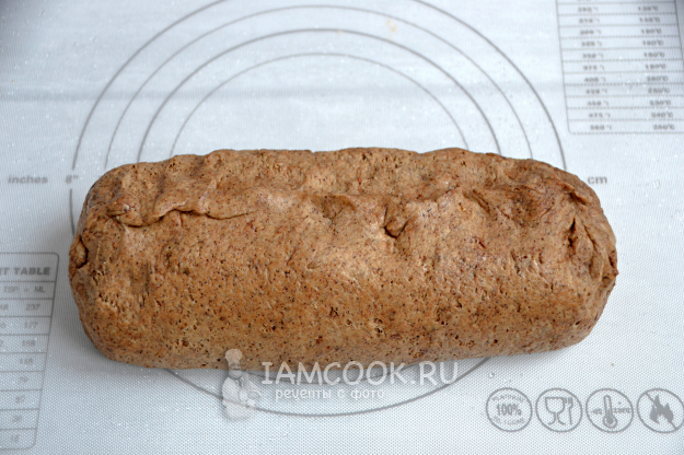 Выложите тесто на рабочую поверхность стола. Руками разровняйте его в пласт по ширине формы для выпечки. Выпекать такой хлеб можно как в форме, так и просто на противне, придав ему продолговатую форму батона.