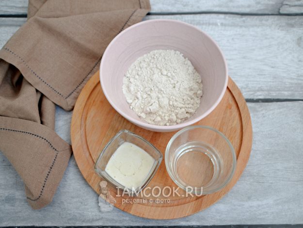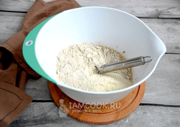 Всыпьте в миску муку - ржаную и пшеничную. Руками замесите тесто. Тесто липкое, поэтому для работы с тестом смажьте стол растительным маслом, вымешивайте тесто до однородной текстуры.