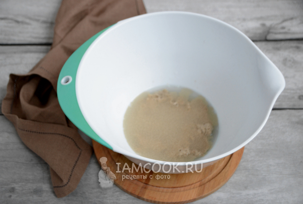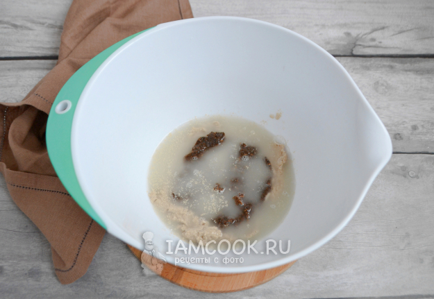 Утром, когда готова опара, приступайте к замешиванию теста. В миску для замешивания теста влейте воду комнатной температуры, выложите опару. Можно добавить немного (около 2 г) сухих дрожжей для активации процесса брожения или если не уверены в своей закваске.
