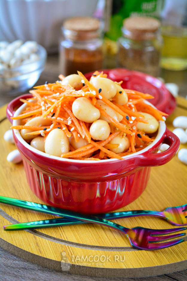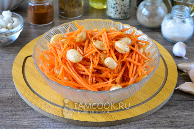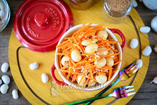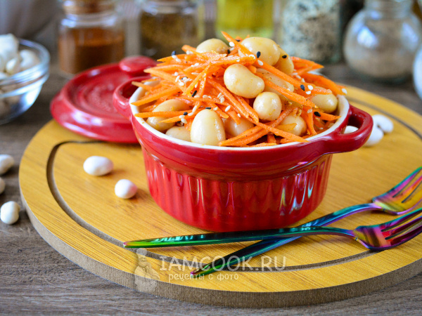 Готовую морковь по-корейски с фасолью подавайте к столу, посыпав кунжутом или зеленью.