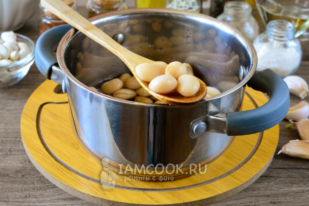 Белую фасоль замочите в воде на ночь, затем отварите в течение 40-45 минут до мягкости. В конце посолите по вкусу, остудите.