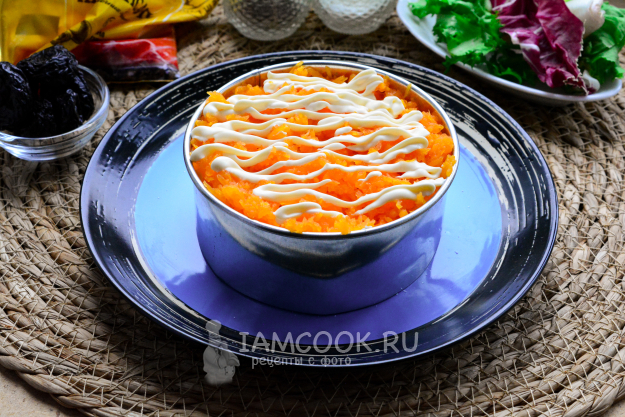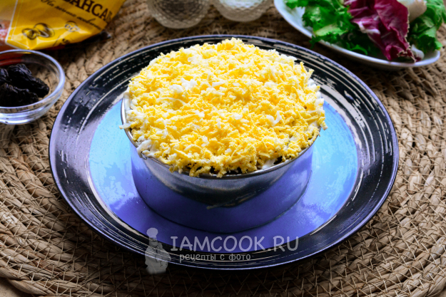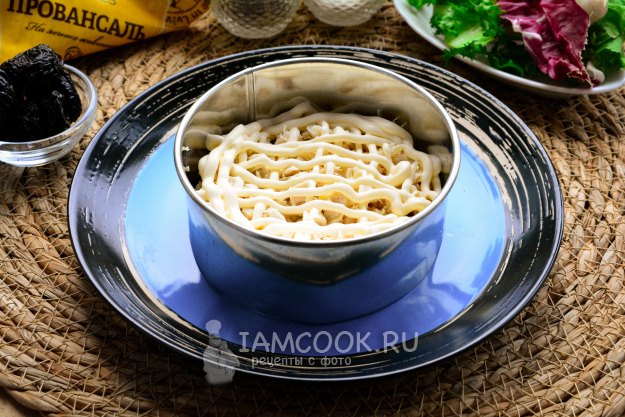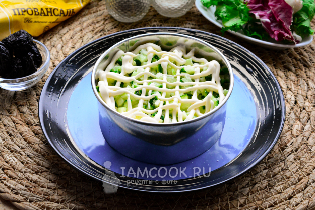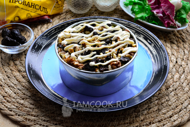 Чернослив и грецкие орешки измельчите, нарежьте ножом, перемешайте. Эту смесь выложите в салат, добавьте майонез.